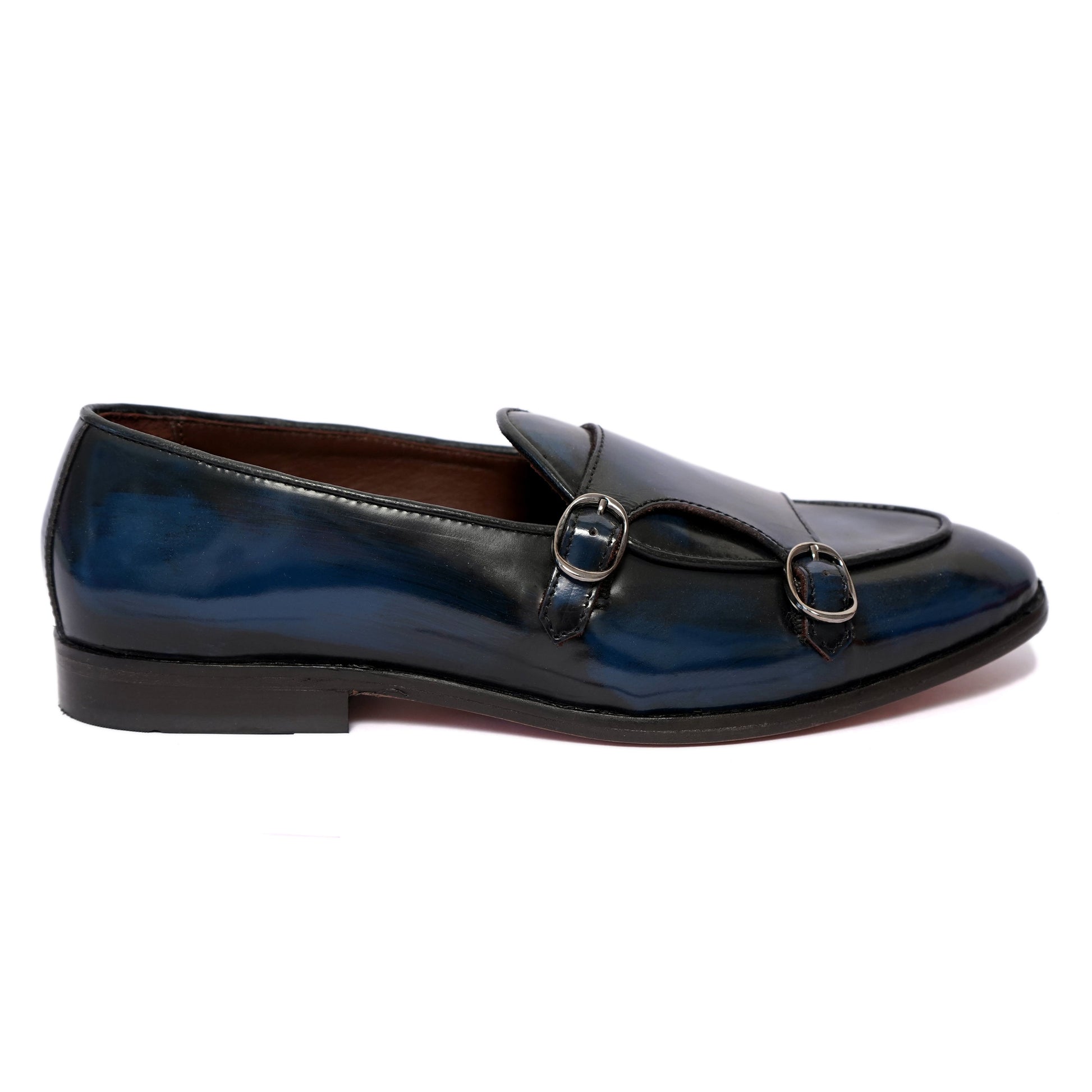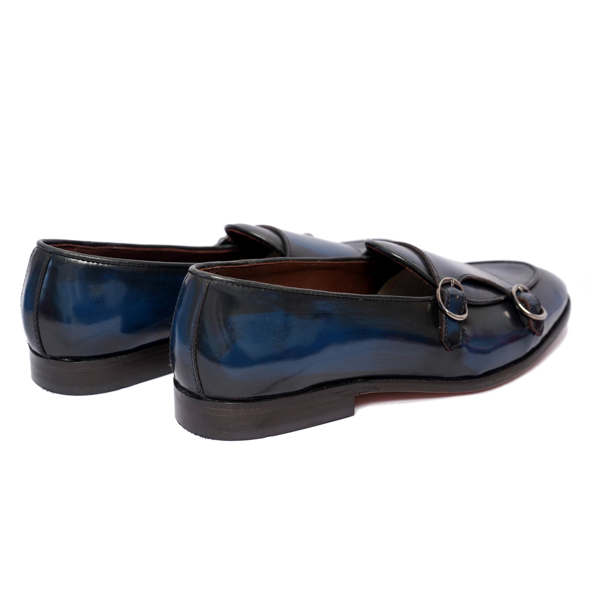 Blue Brushoff Calf Leather Belgian Monk Straps Loafers. Leather Lining on the inside with an all leather cushioned foot bed. Leather Shoe Sole hand sewn with welt and Shoe upper. Each pair is carefully hand crafted using finest techniques that symbolises the craftsmanship of our brand.