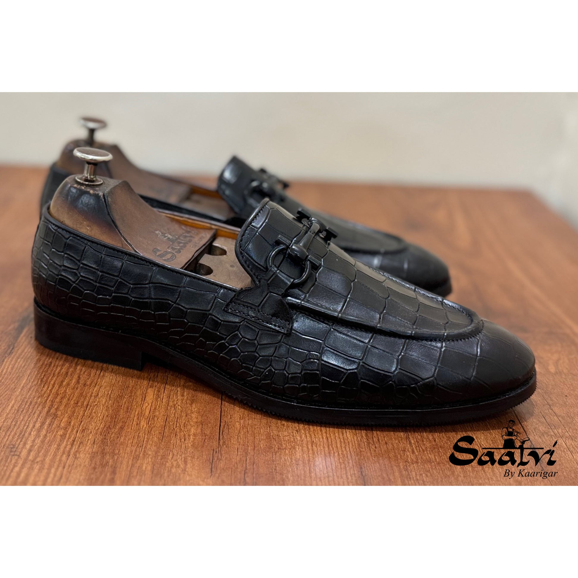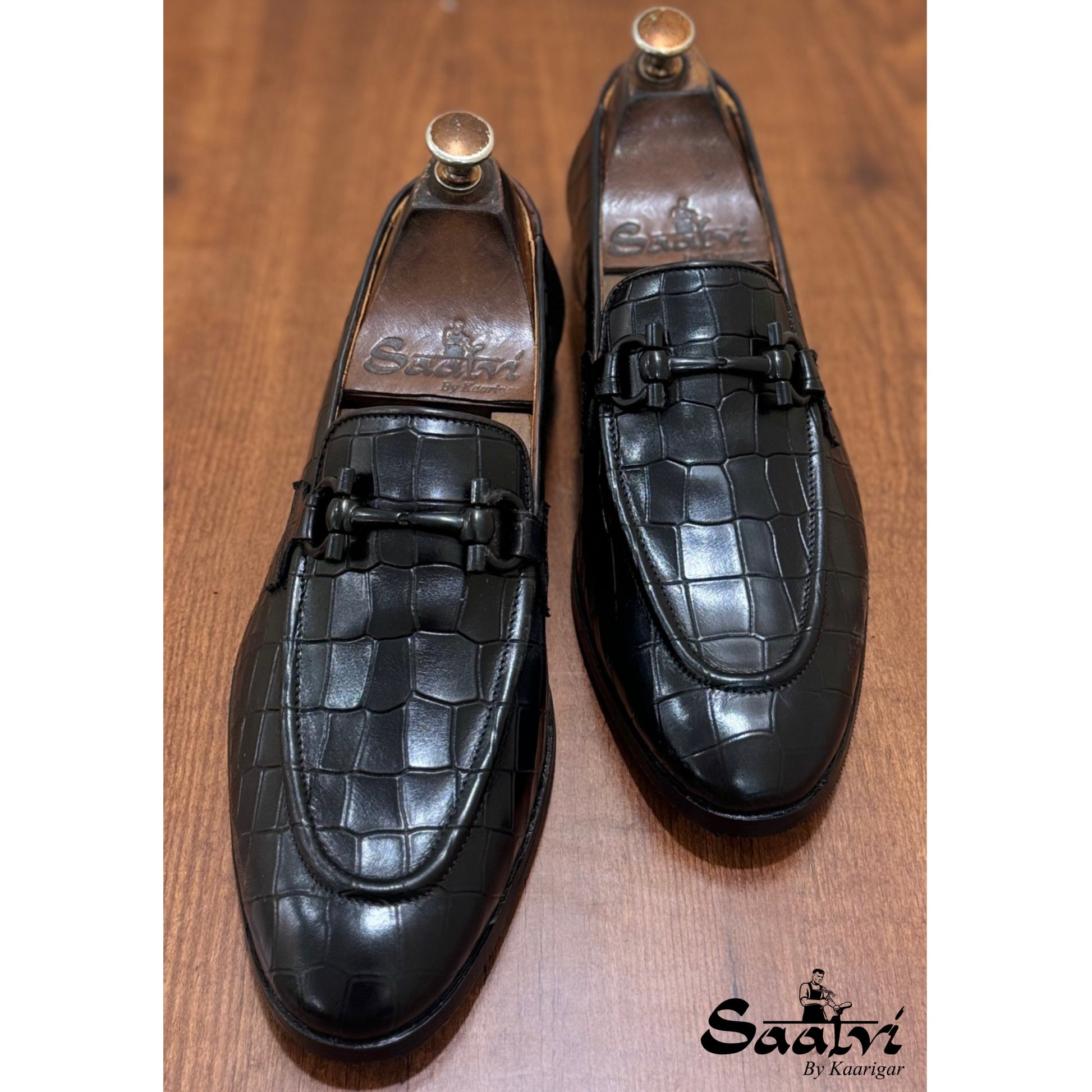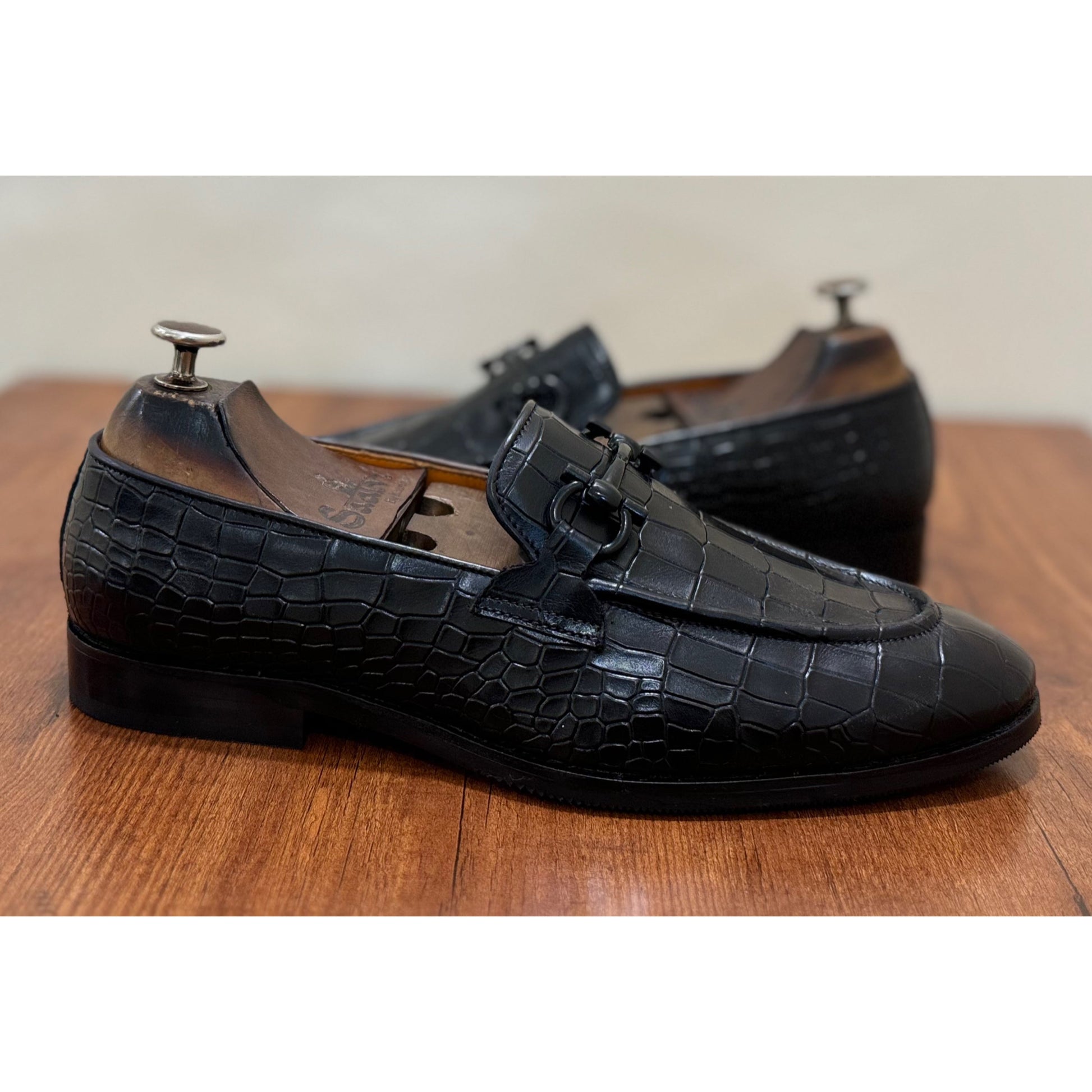 Black Crocodile Loafers With Black Metal Trim