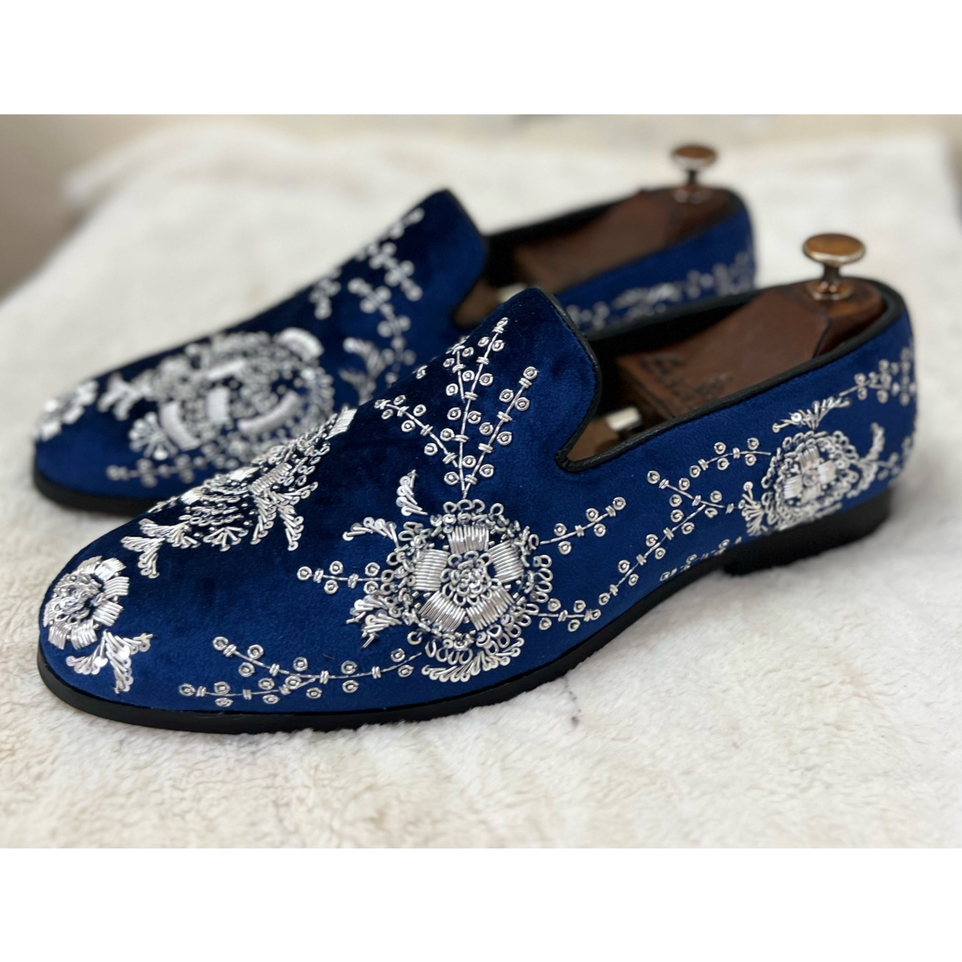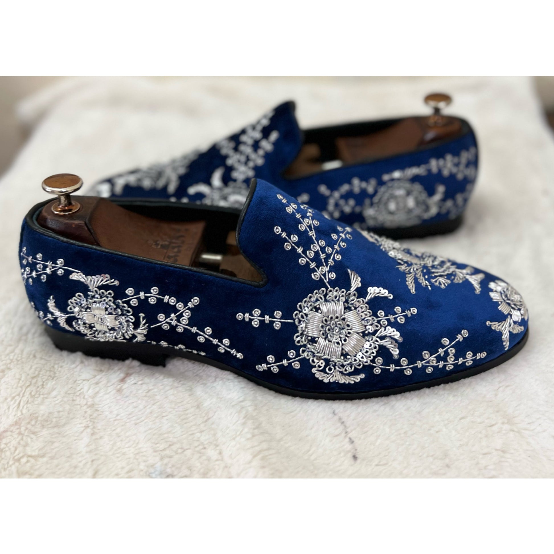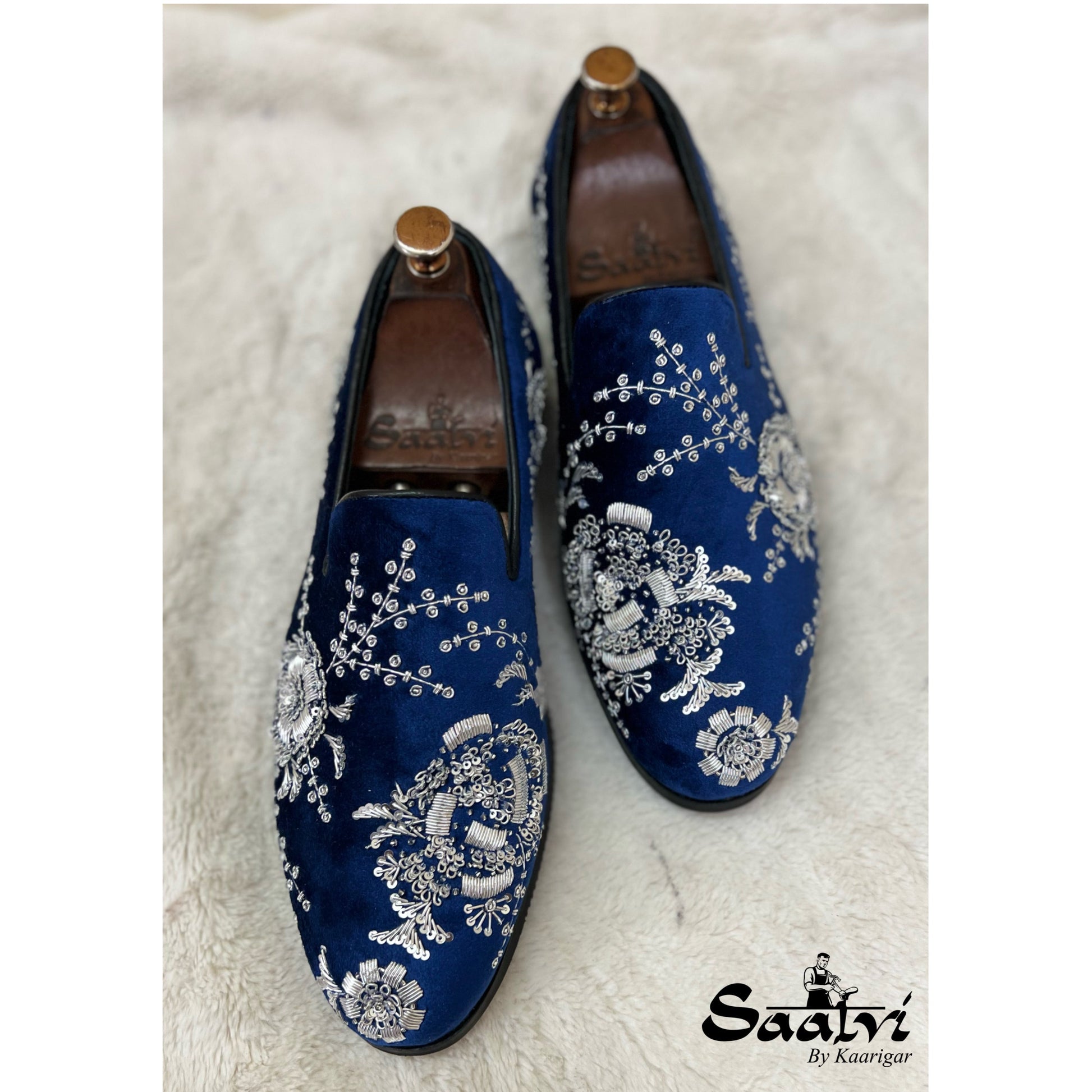Blue Velvet Silver Zardosi Embroidery Slip-ons